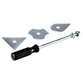Consta de un mango de 22 cm de largo y tres cuchillas intercambiables con diferentes perfiles para superficies rectas, esquinas y bordes. Los rascadores se pueden utilizar de forma especialmente efica